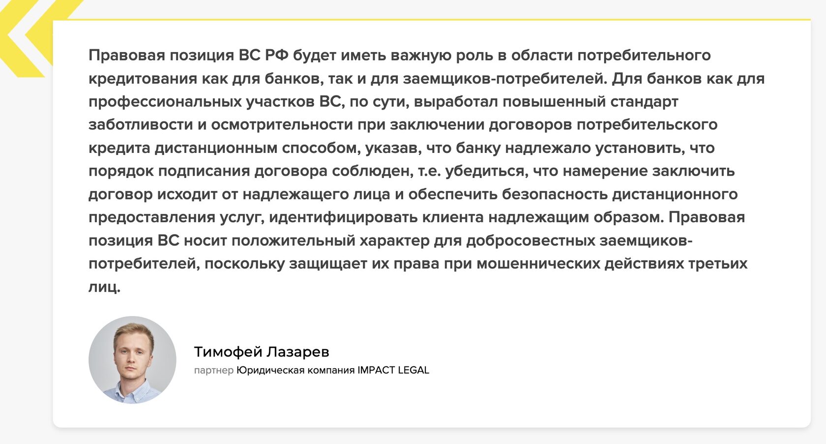 В комментируемом определении ВС РФ, по словам Тимофея Лазарева, также исследовал вопросы о соблюдении письменной формы кредитного договора и волеизъявлении на заключение договора. Так, по вопросу соблюдения письменной формы кредитного договора ВС РФ, по сути, согласился с позицией Банка России о том, что конклюдентные действия заемщика либо телефонный звонок в адрес кредитора с информированием последнего о согласии на получение потребительского кредита не равнозначны ни собственноручной подписи заемщика, ни ее аналогу, т.е. не соответствуют требованиям Закона о потребительском кредите.