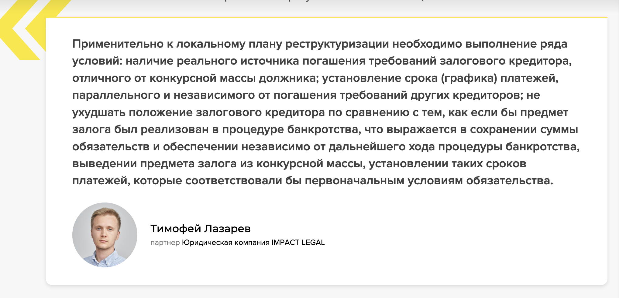 Применительно к локальному плану реструктуризации необходимо выполнение ряда условий: наличие реального источника погашения требований залогового кредитора, отличного от конкурсной массы должника; установление срока (графика) платежей, параллельного и независимого от погашения требований других кредиторов; не ухудшать положение залогового кредитора по сравнению с тем, как если бы предмет залога был реализован в процедуре банкротства, что выражается в сохранении суммы обязательств и обеспечении независимо от дальнейшего хода процедуры банкротства, выведении предмета залога из конкурсной массы, установлении таких сроков платежей, которые соответствовали бы первоначальным условиям обязательства.