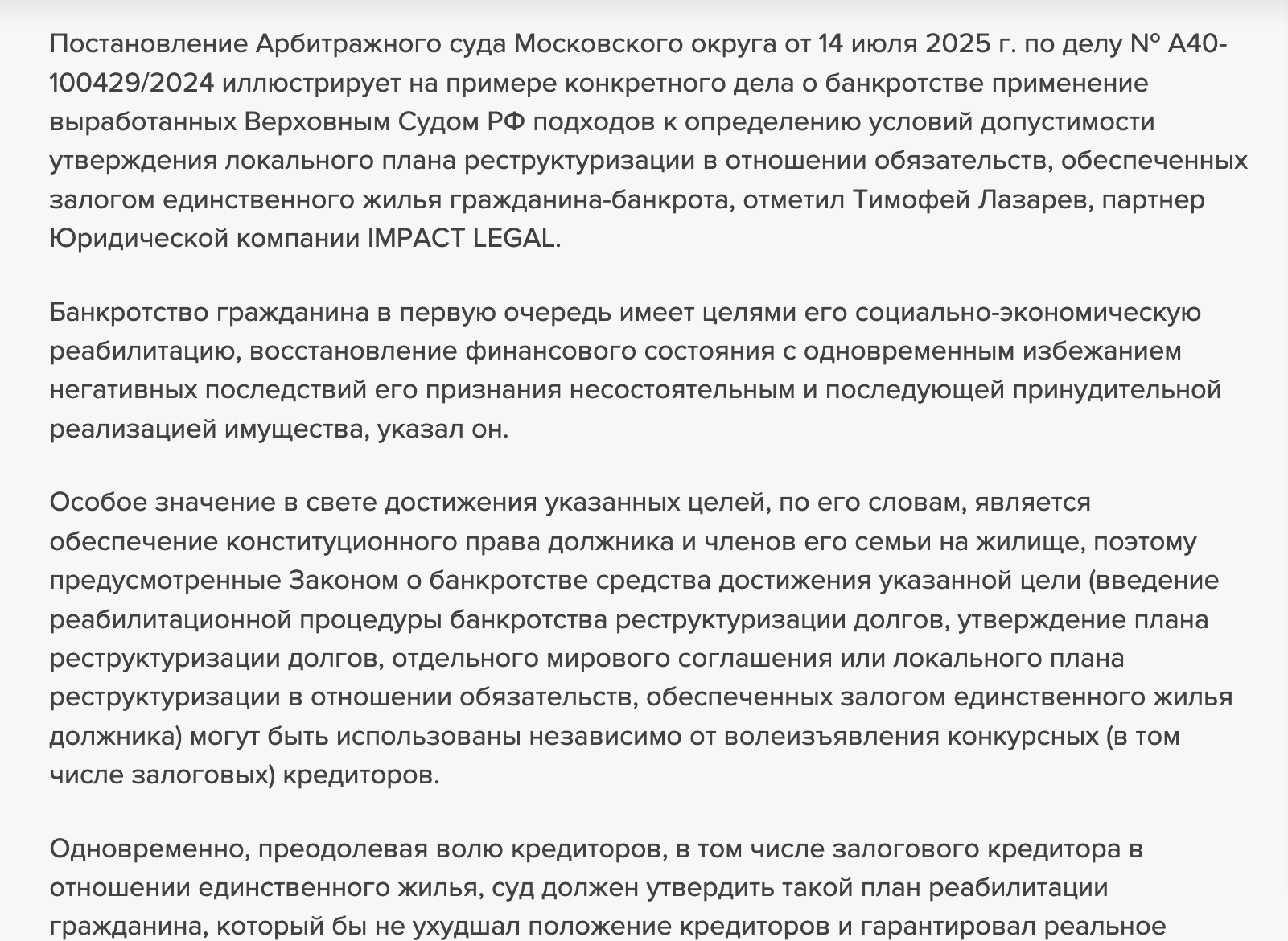 Постановление Арбитражного суда Московского округа от 14 июля 2025 г. по делу № А40-100429/2024 иллюстрирует на примере конкретного дела о банкротстве применение выработанных Верховным Судом РФ подходов к определению условий допустимости утверждения локального плана реструктуризации в отношении обязательств, обеспеченных залогом единственного жилья гражданина-банкрота, отметил Тимофей Лазарев, партнер Юридической компании IMPACT LEGAL.