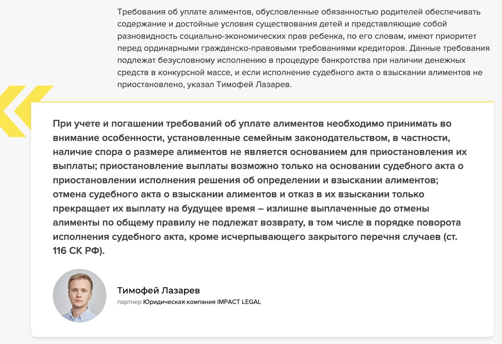 Требования об уплате алиментов, обусловленные обязанностью родителей обеспечивать содержание и достойные условия существования детей и представляющие собой разновидность социально-экономических прав ребенка, по его словам, имеют приоритет перед ординарными гражданско-правовыми требованиями кредиторов. Данные требования подлежат безусловному исполнению в процедуре банкротства при наличии денежных средств в конкурсной массе, и если исполнение судебного акта о взыскании алиментов не приостановлено, указал Тимофей Лазарев.